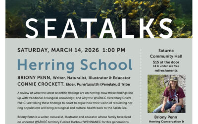 Briony Penn is a fifth-generation islander who witnessed the extirpation of resident herring spawns from overfishing in her home harbour of Fulford in the 80s. Through her work as a naturalist on the coast, an educator in both university and community classrooms and an author and illustrator of award-winning books on the coast and its custodians, she has spoken out against the commercial herring fishery and fish farms for over 30 years. “The only way to stop the silent spring of the coast is to restore herring populations back to the levels that existed prior to colonization.”